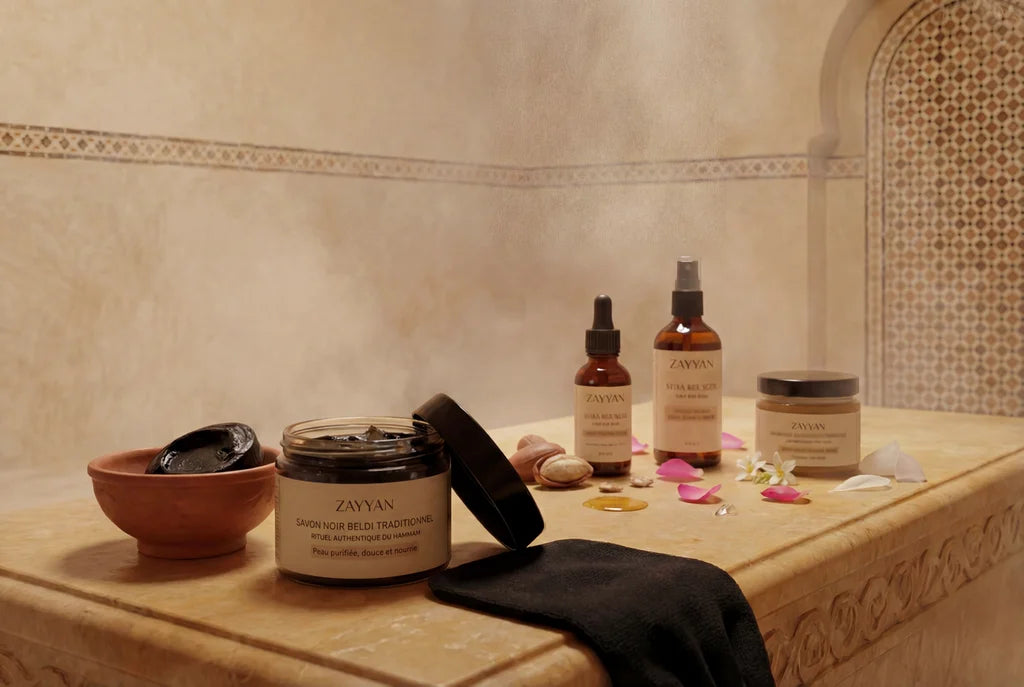 Le savon noir beldi et le gant kessa nettoient la peau en profondeur, comme au hammam traditionnel.